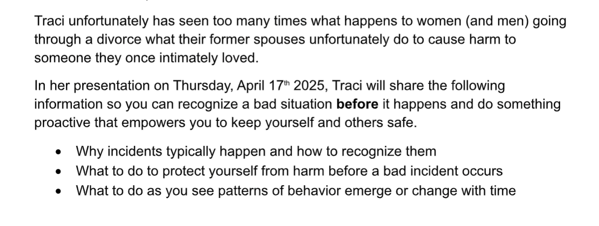 This event is completely free to all FIRST-TIME attendees. It is an opportunity to learn more about the Divorce Transition Professionals. If you are a professional with divorce expertise, please check us out.